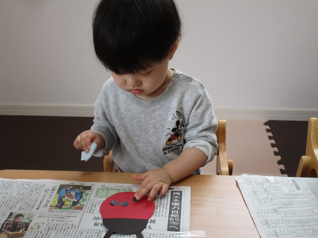 てんとう虫には背中にシールを貼って模様を付けました🐞
