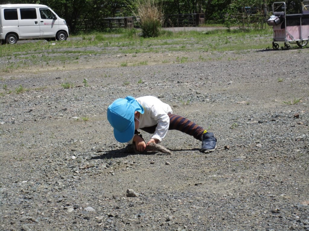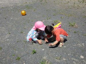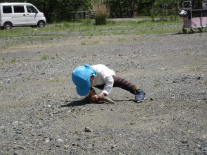 たくさん体を動かした後は草っ原で虫探しをしたり、地面の砂を集めたり、