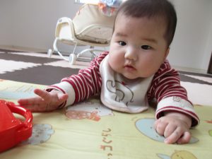腹這いで遊んでいる時に、手の届くところに玩具を置いてあげると