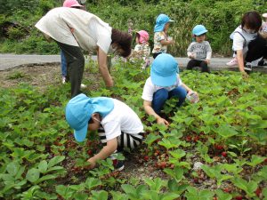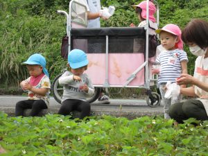 今日は、1・2歳児さんは昨日のお散歩で見てきた畑に実っている