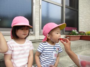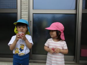 園に帰ってお水で良く洗い、そのまま園庭でまずはひと口お味見!!