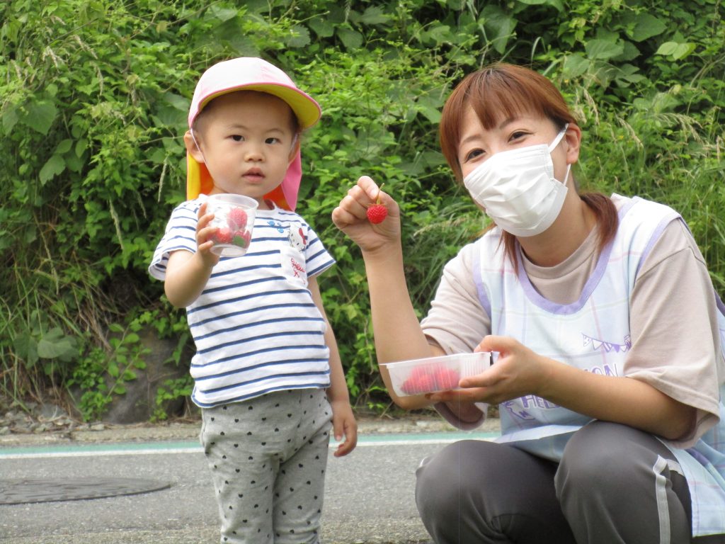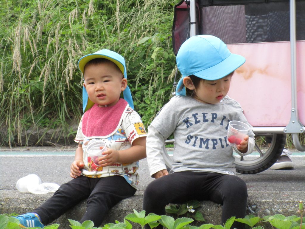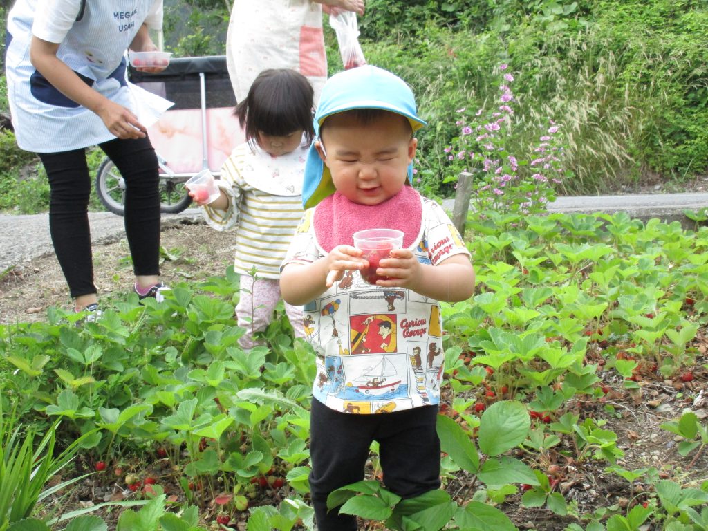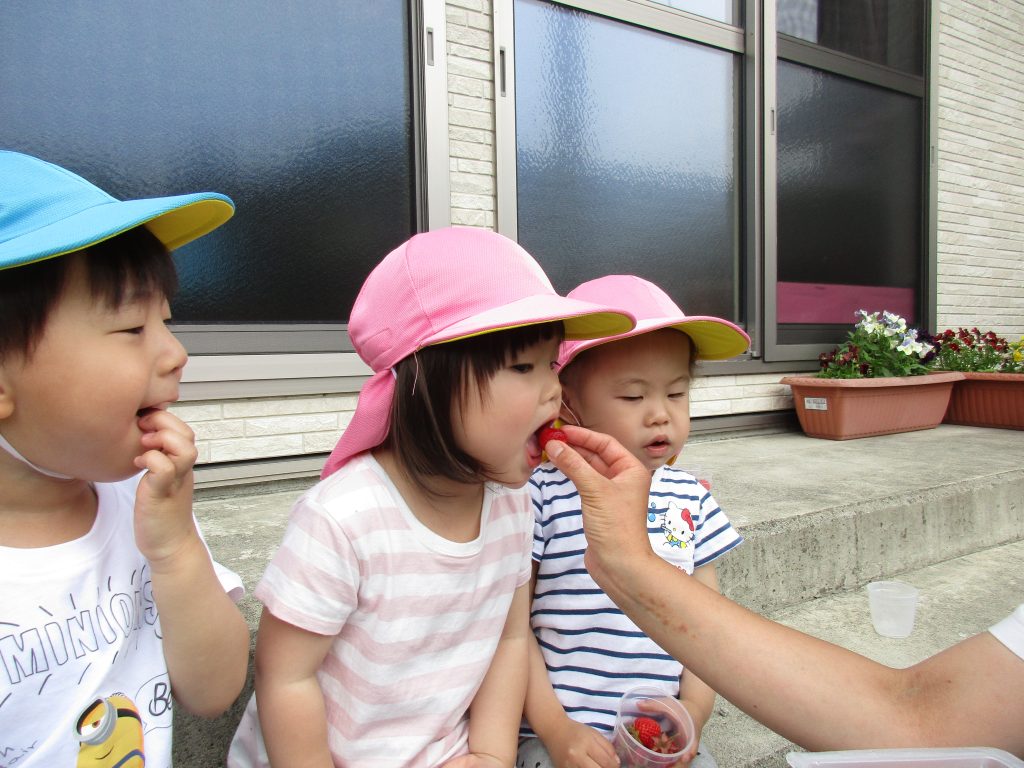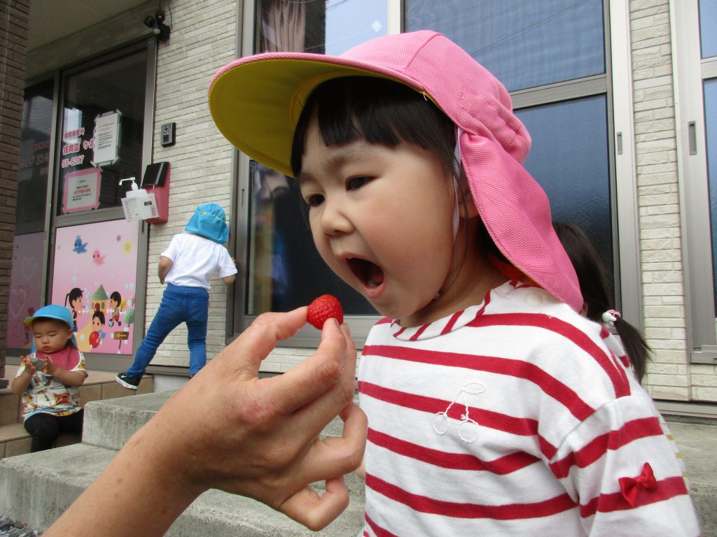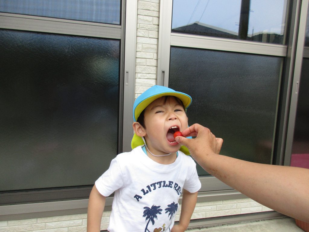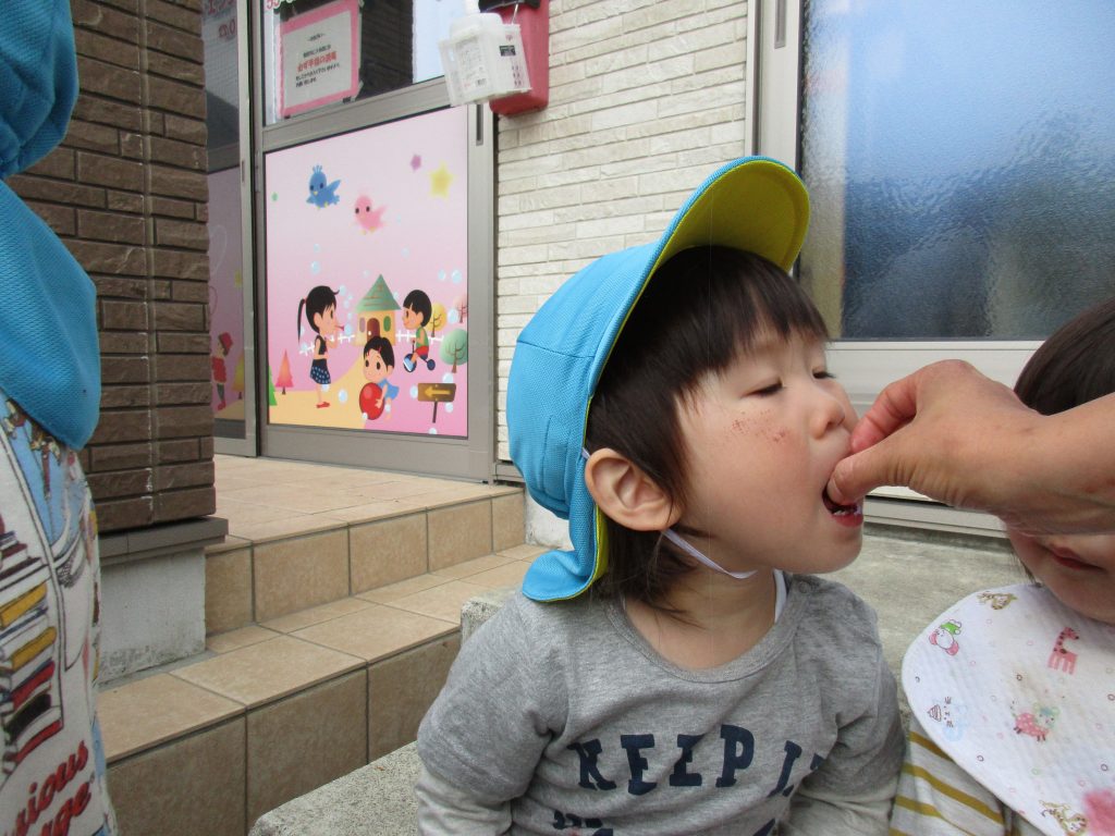 園に帰ってお水で良く洗い、そのまま園庭でまずはひと口お味見!!