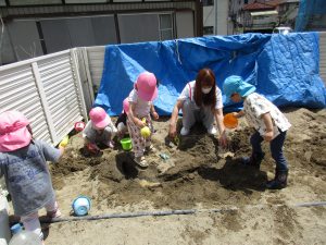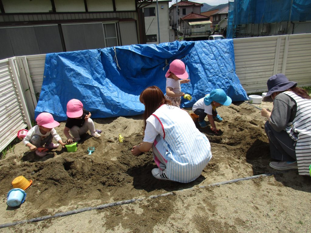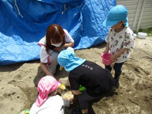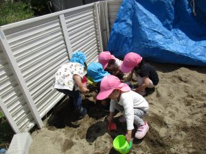 お友達の誕生日のお祝いをしたり、先生と一緒にお池や川を作って