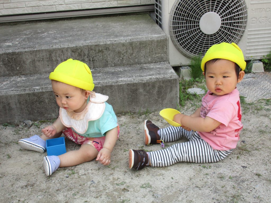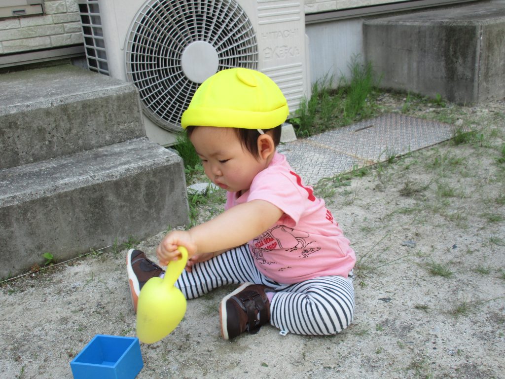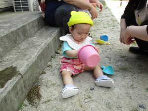 0歳児さんも少しの時間でしたが、シャベルやバケツを持って遊びました(*^_^*)