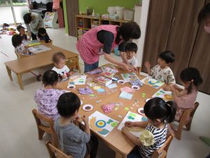 あじさいの形をした台紙に赤・青・白色でスタンピングをしました(^_^)