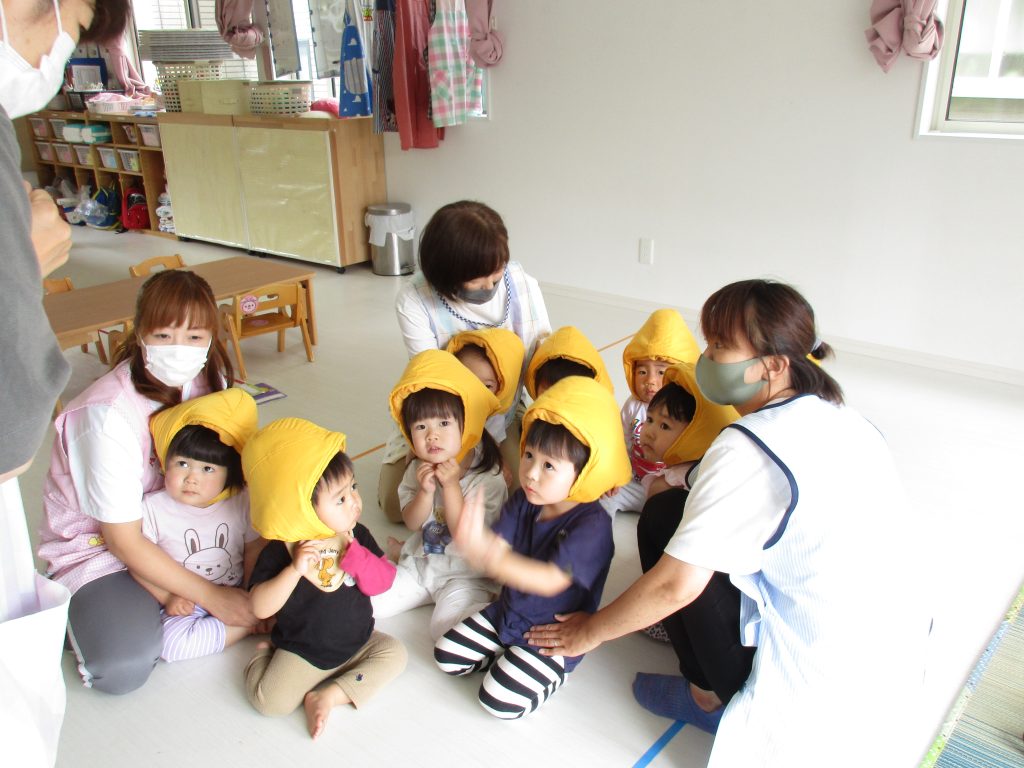 防災頭巾を被って先生のお話しを聞いている1・2歳児さんと