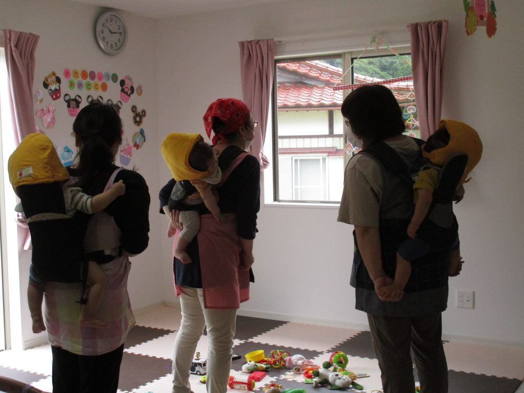 先生におんぶして避難準備万端の0歳児さんです( ´∀`)