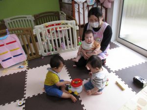 避難訓練の後は0歳児さんは玩具遊び、1・2歳児さんは