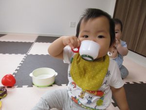 コップを上手に持って飲むお友達!