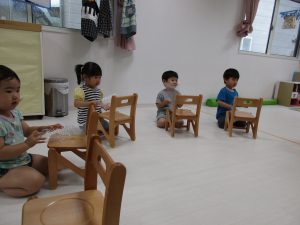 椅子取りゲームをしたり、隣りのお友達の名前を呼びぬいぐるみを手渡すゲームをしたりしました(^o^)