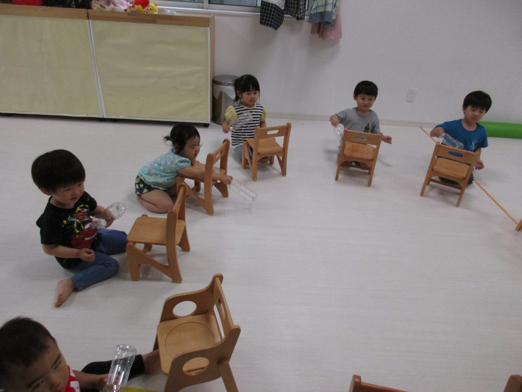 椅子を太鼓代わりにし、ペットボトルをバチの代わりにして音楽に合わせて叩いたり