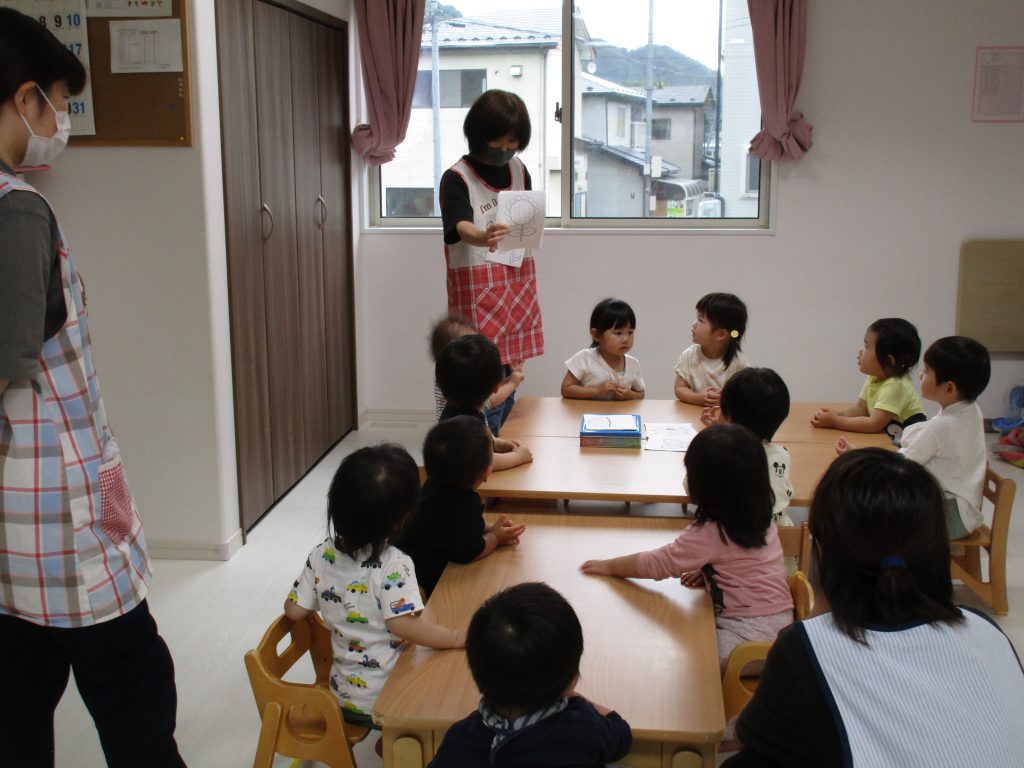 1・2歳児さんはシール貼りをする前に貼り方の説明を聞きました👂