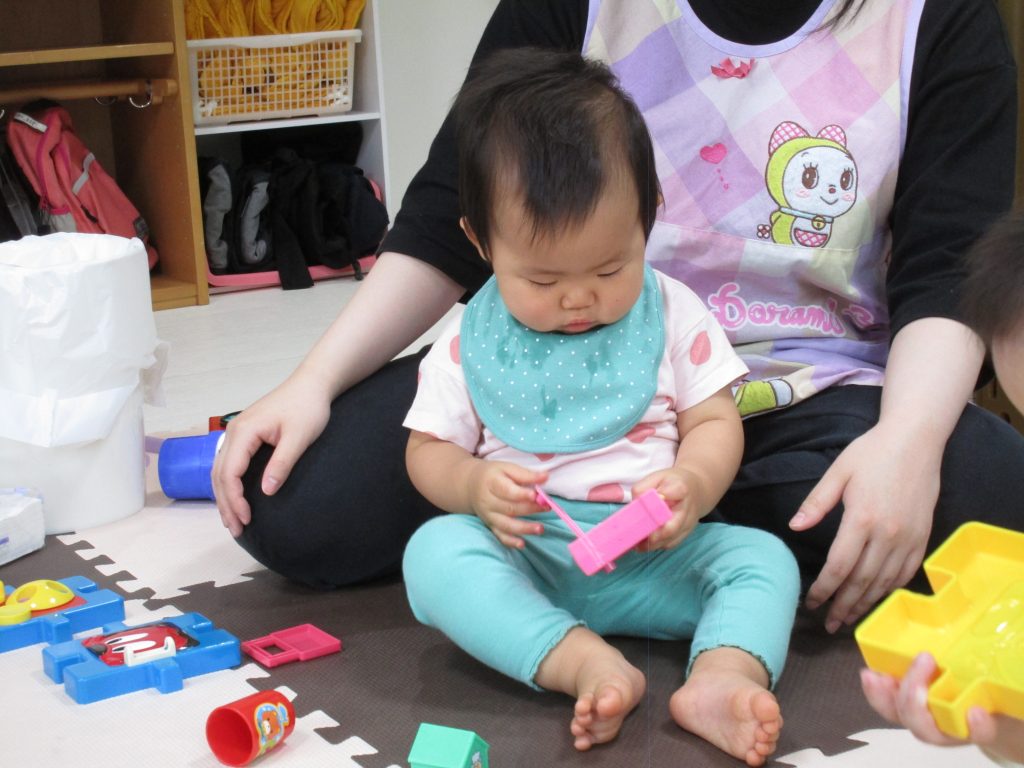 0歳児さんは1・2歳児さんのお部屋の色々玩具を借りてきて遊びました!!