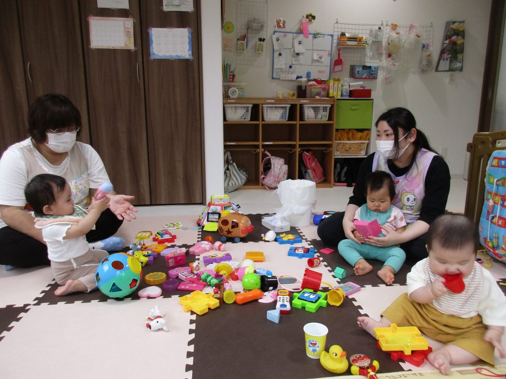 0歳児さんは玩具遊び、1・2歳児さんはシール貼りをしたり
