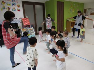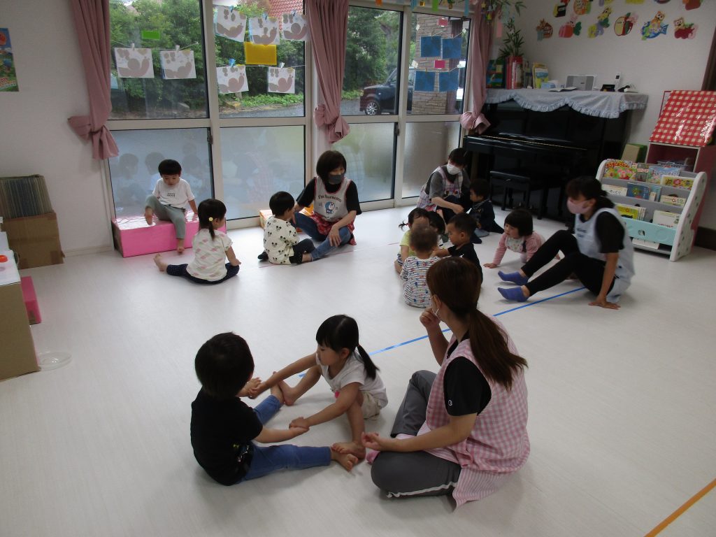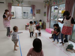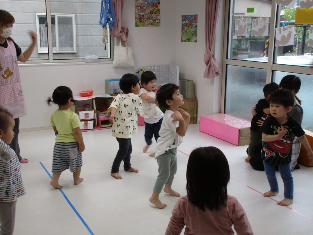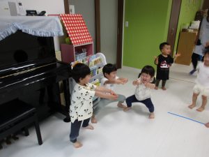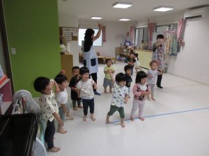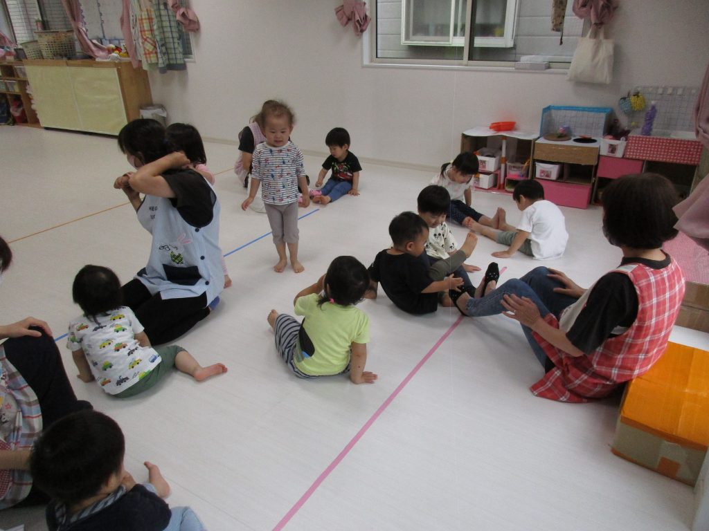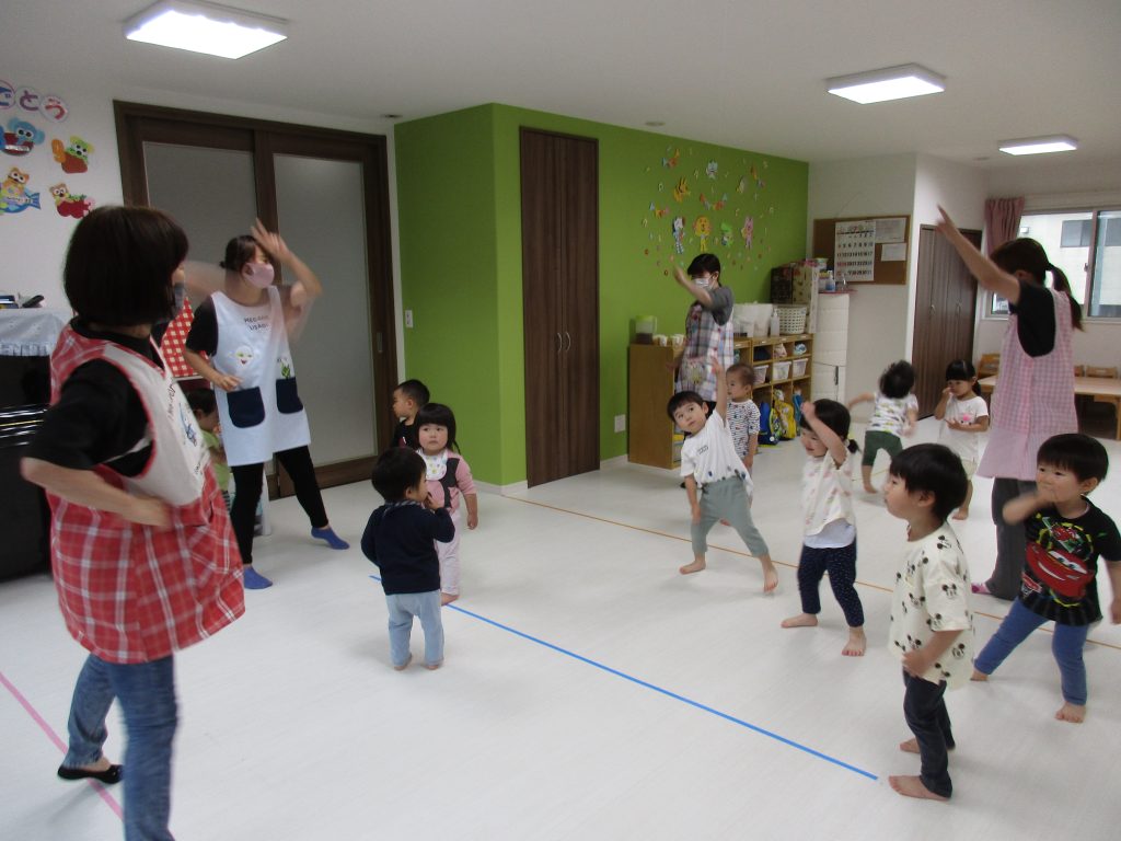 1・2歳児さんはシール貼りの後は色々な体操をしいて体を動かしました!!