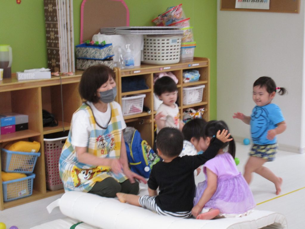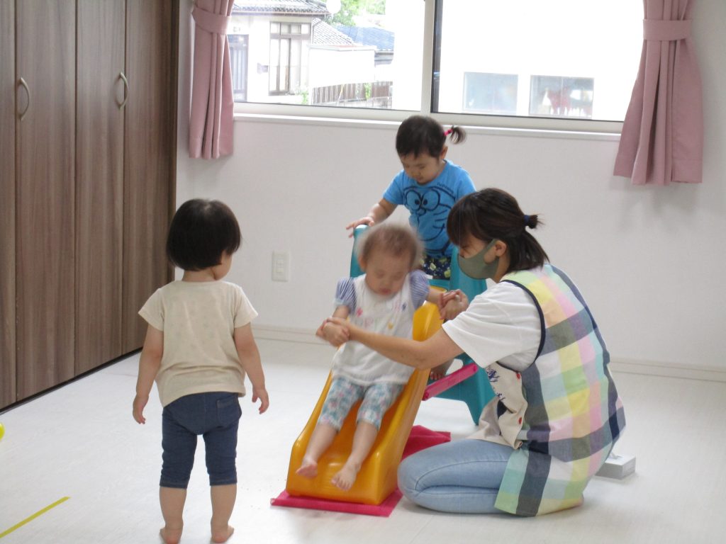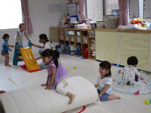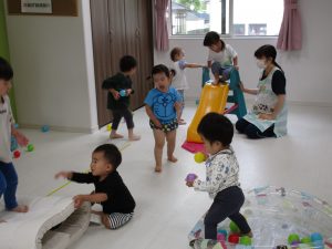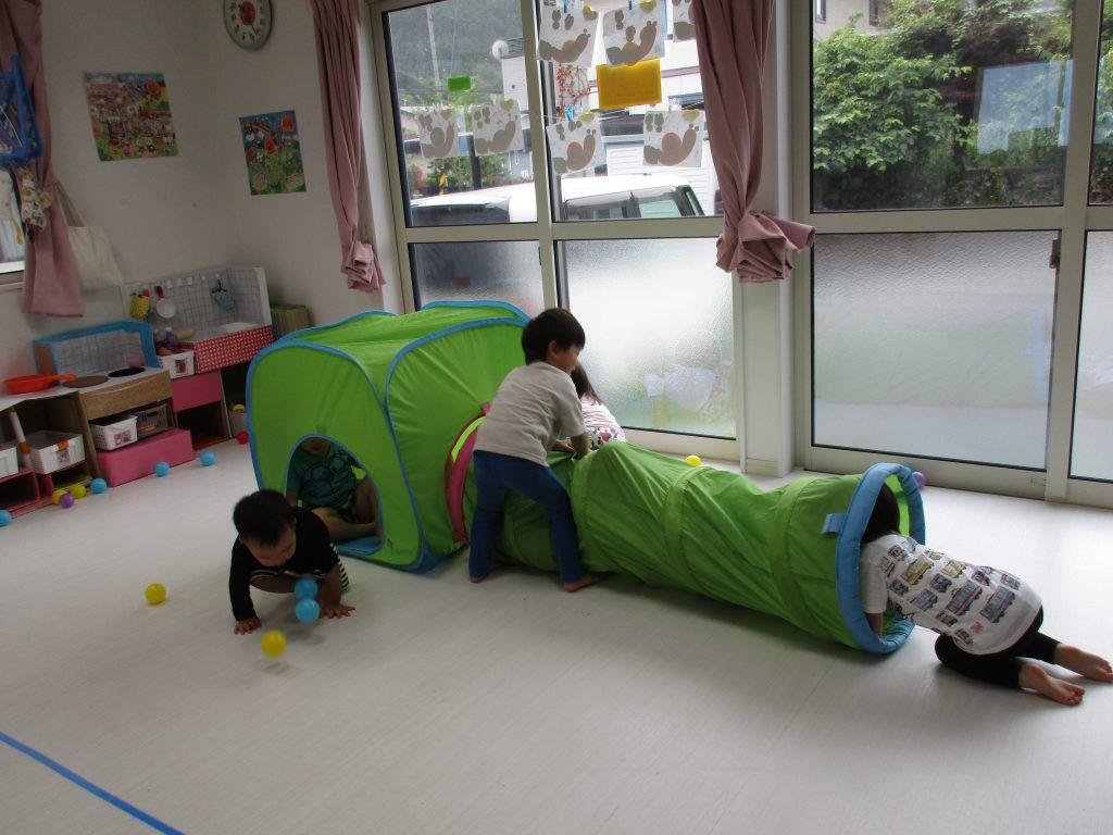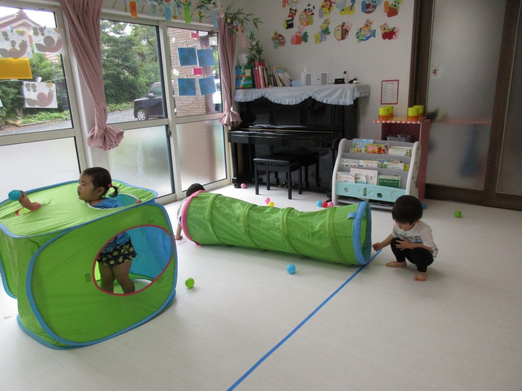 今日は0歳児さんは玩具遊び、1・2歳児さんはすべり台・トンネル・