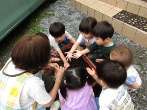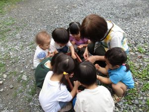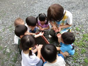 とてもとても小さい種を手の平にもらい、先生が土に小さな穴を開けて