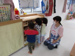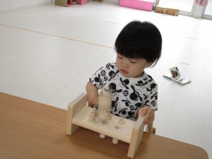 今日は0歳児さんは玩具遊び、1歳児さんはモンテッソーリ教具、