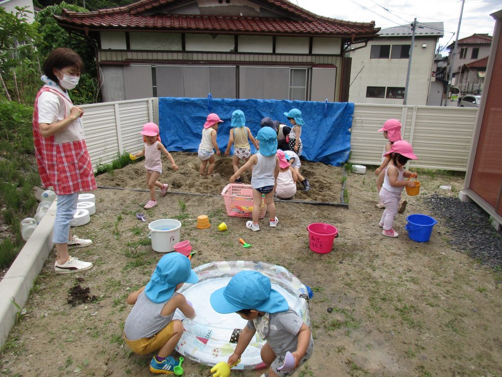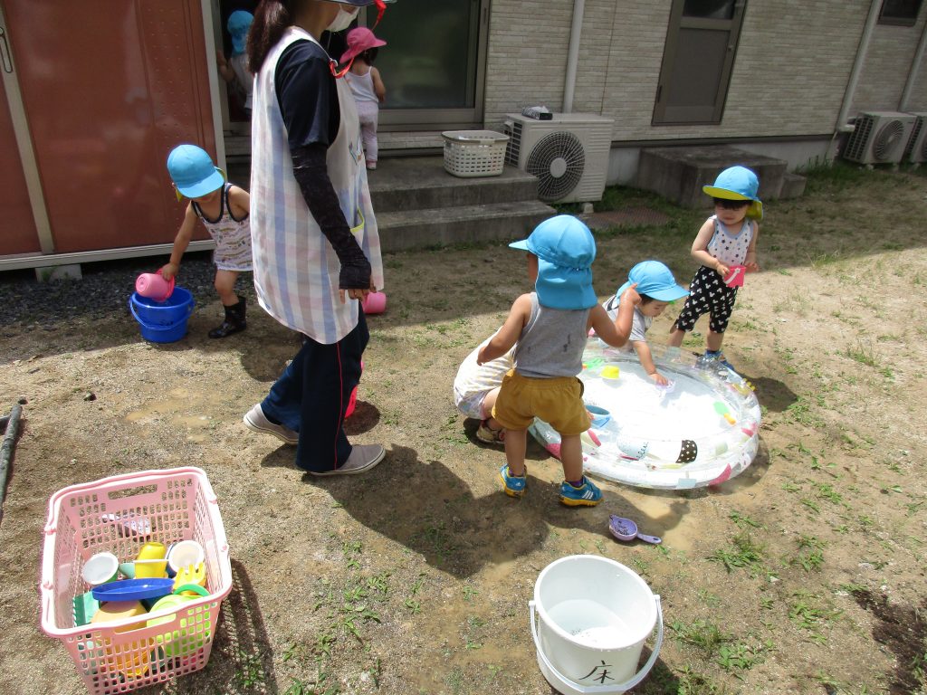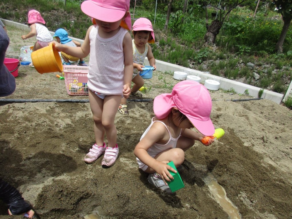 気温も高くなったので砂遊びの他に、プールも出して水遊びもしました(^o^)