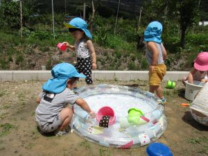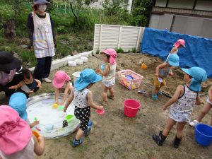 水に手を入れてバシャバシャしたり、バケツやカップ、シャベルなどで