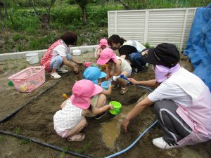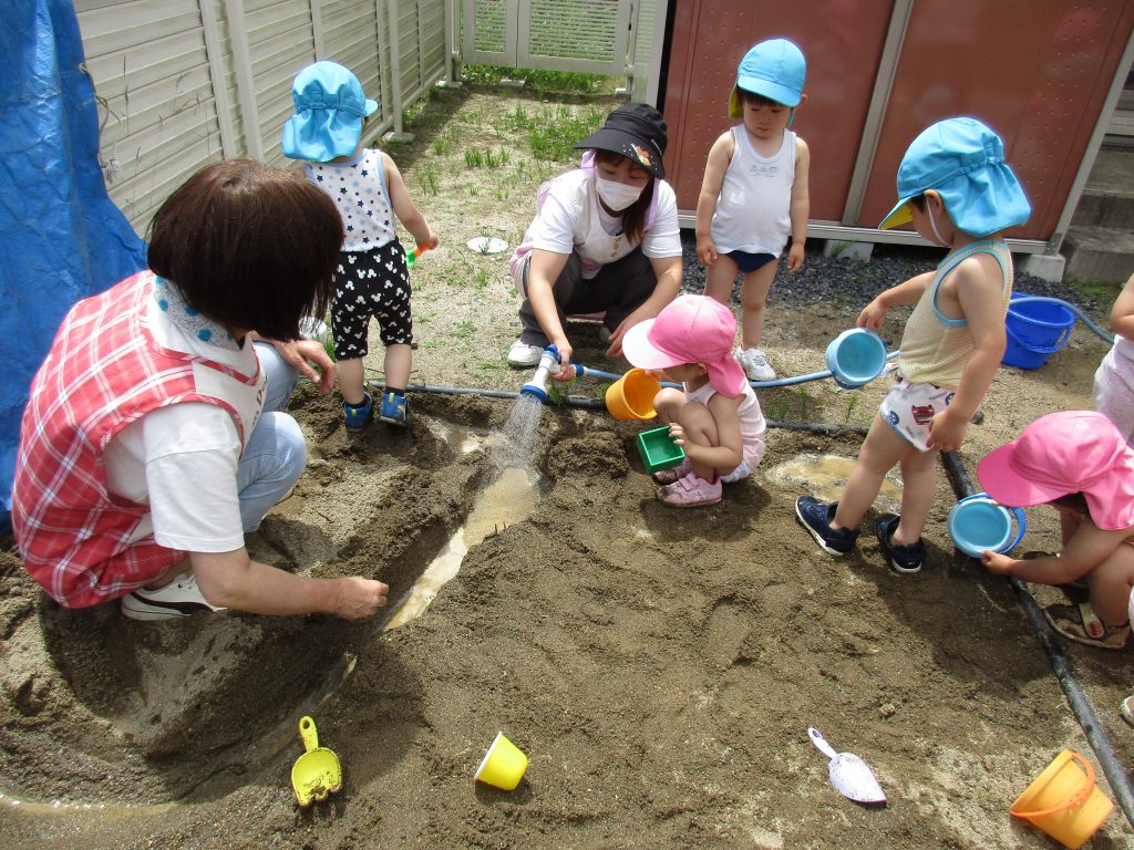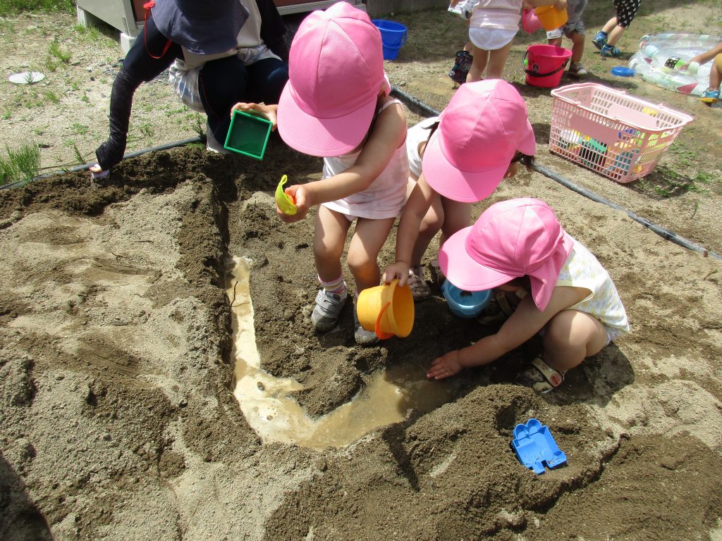 砂場に先生と一緒に川やトンネルを作り、