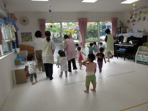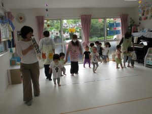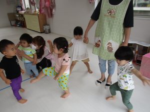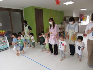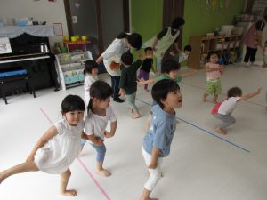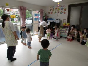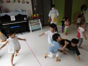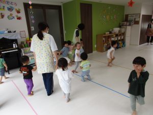 一列になってお部屋の端から端まで歩き、講師の先生が