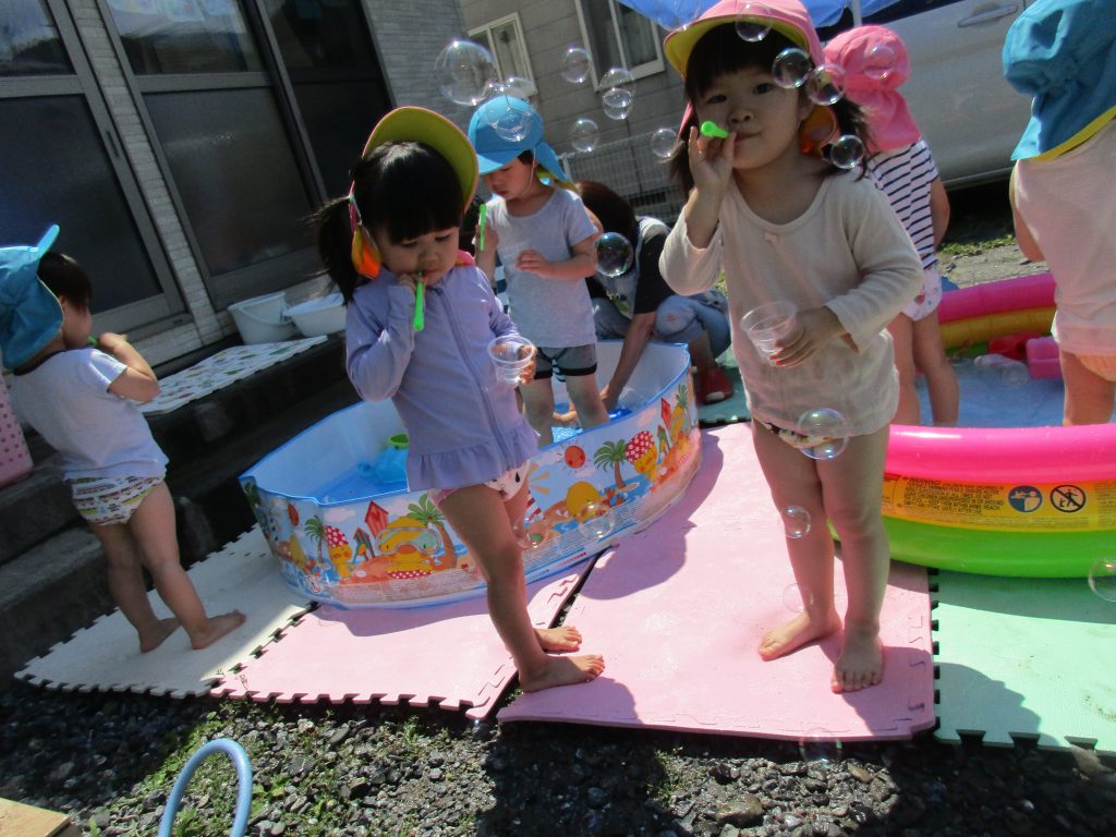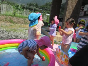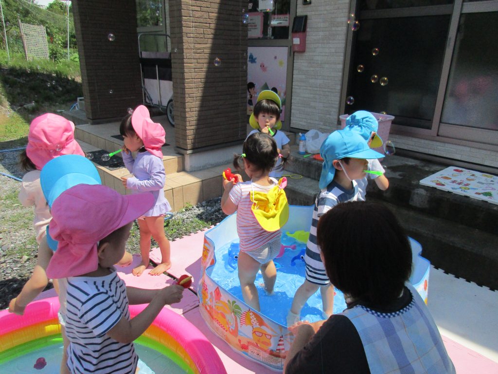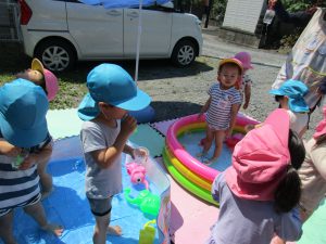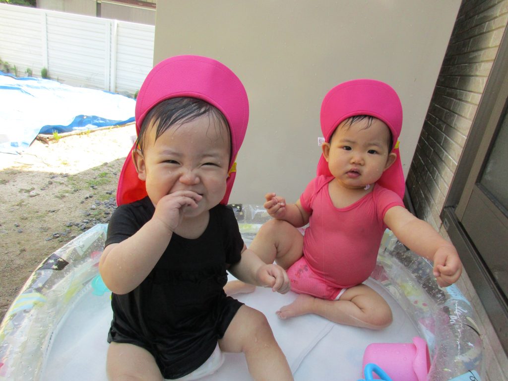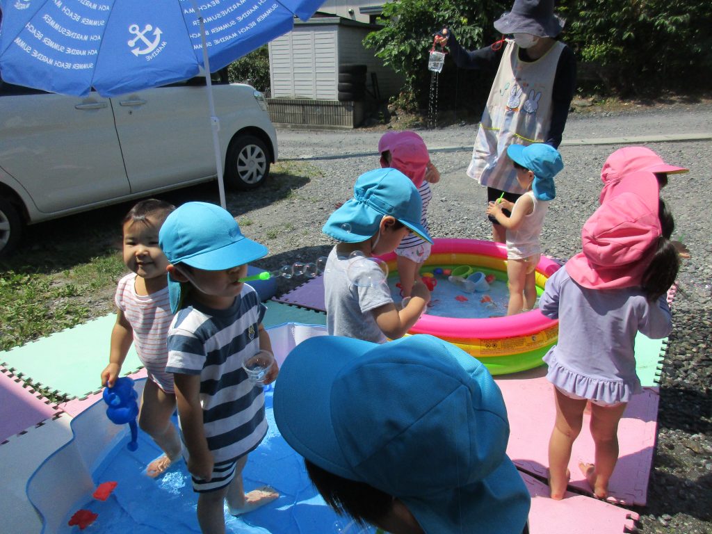 1,2歳児クラスは園庭でプール遊びを行いました♫