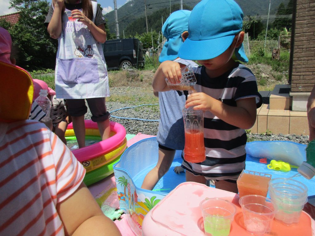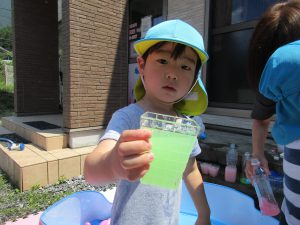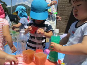 色とりどりの色水を使いとても楽しそうでした❤(ӦvӦ。)