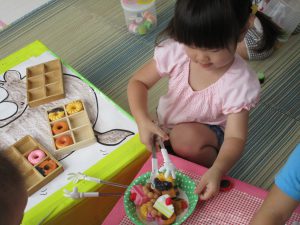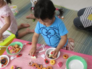 2歳児の女の子はまず始めにドーナツ屋さんのコーナーへ行き、