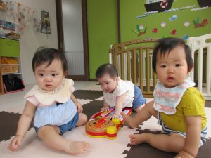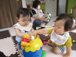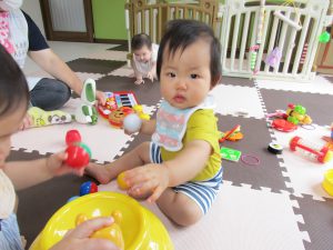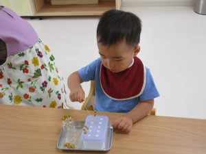 0歳児さんは玩具遊び、1・2歳児さんはモンテッソーリ教具で
