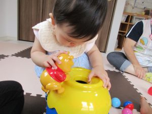 大きいお友達はプーさんのボール落としに繰り返しボールを落としたり、