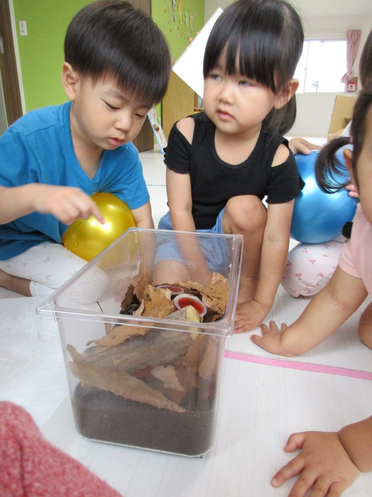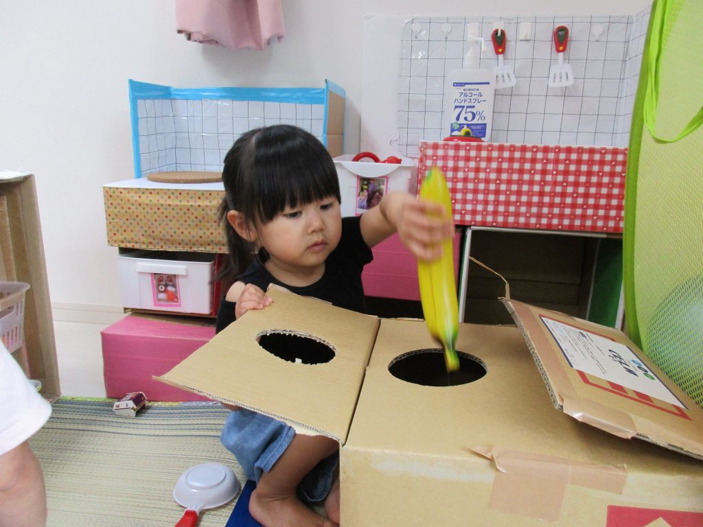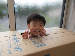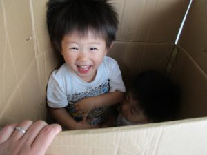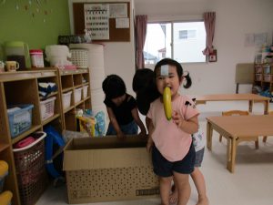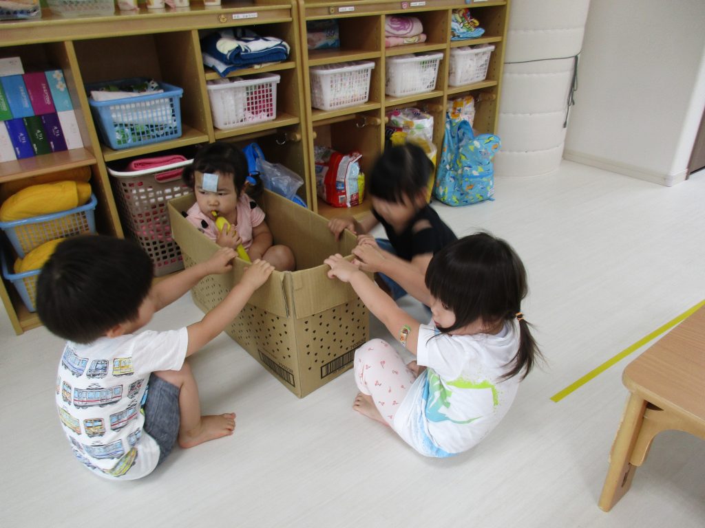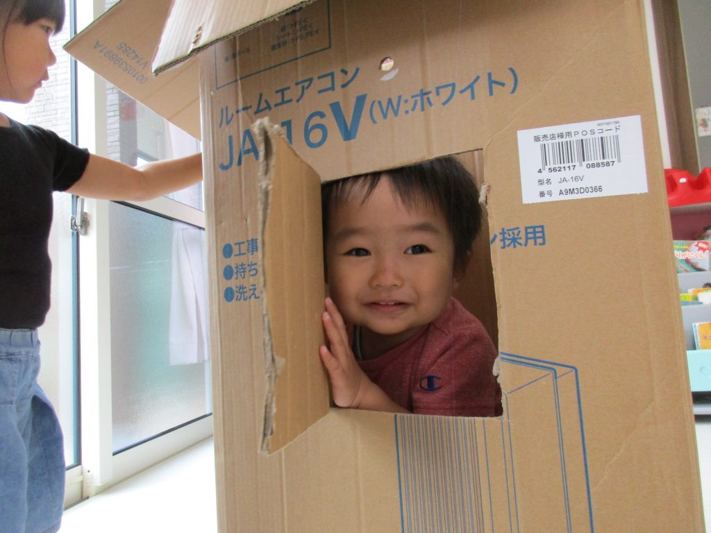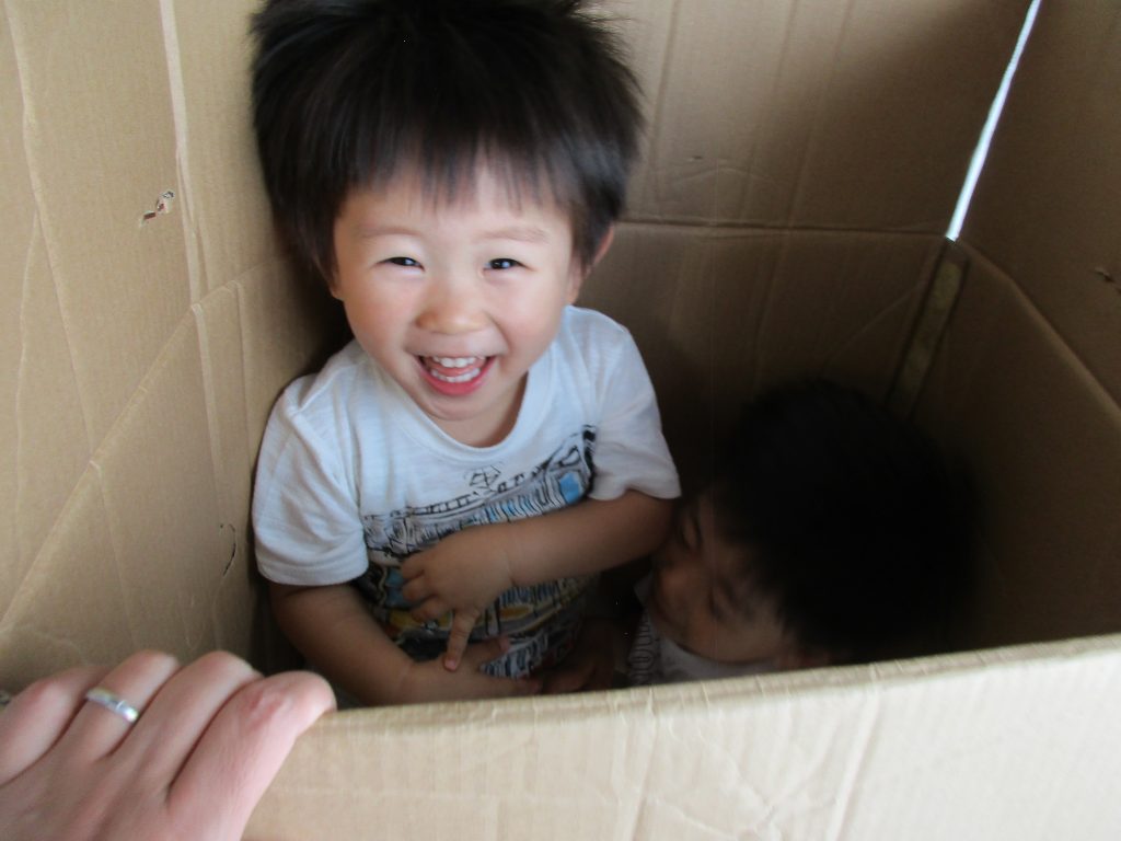 1・2歳児さんはダンボール箱を使って遊びました(^o^)