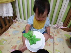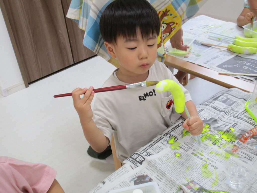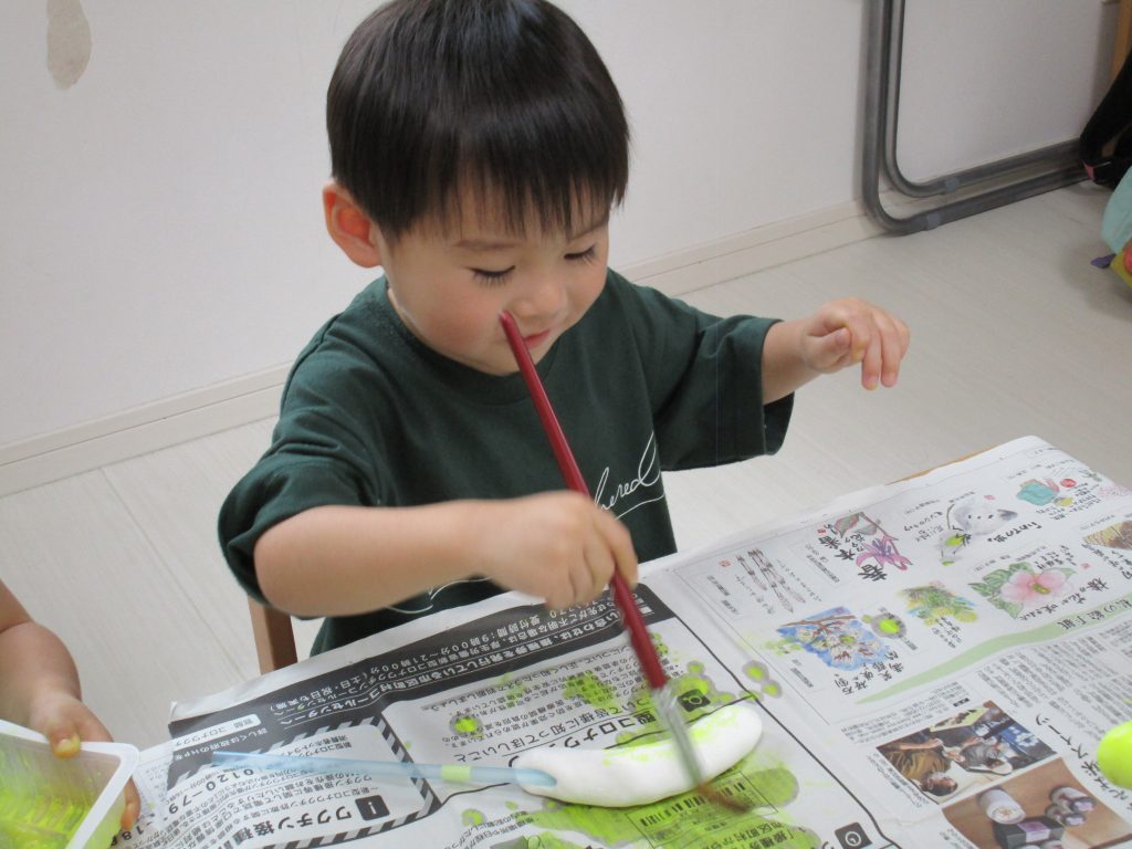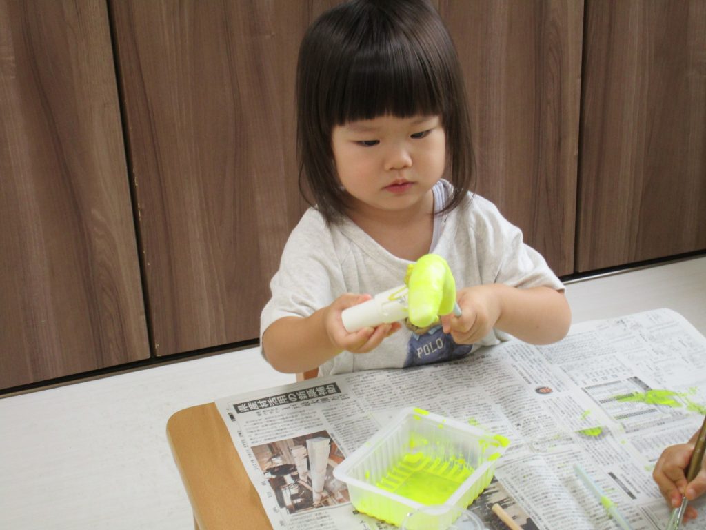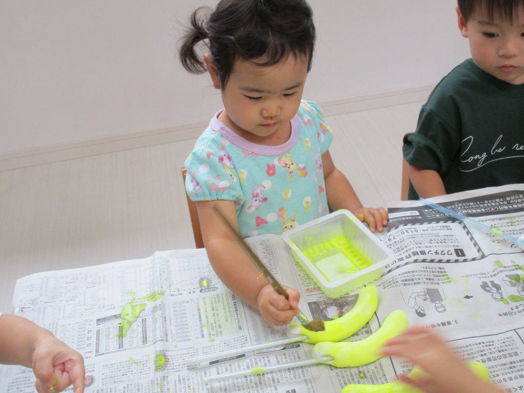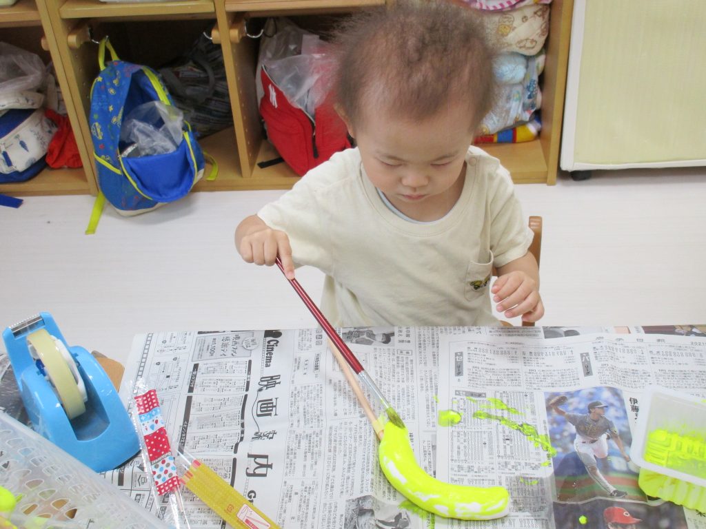 2歳児さんは夏祭りごっこをする時に使うバナナに絵の具で色を付けたり、