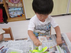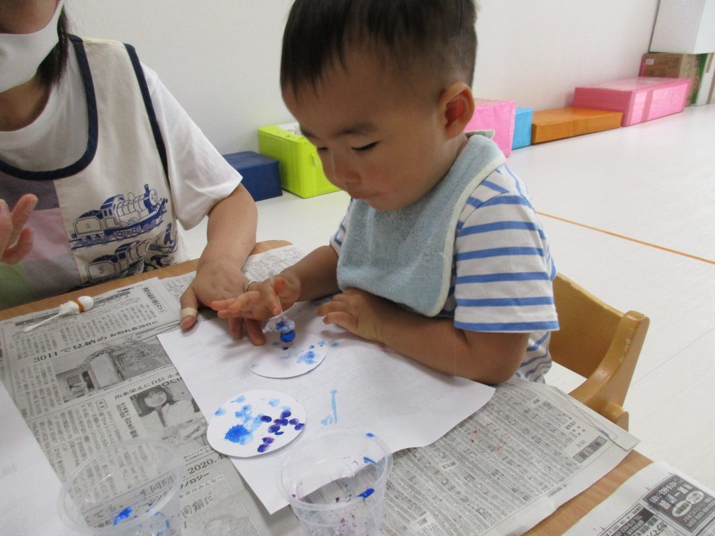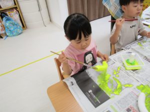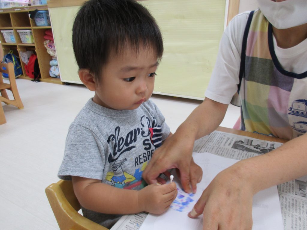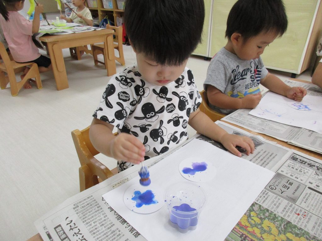 1歳児さんは製作、2歳児さんは夏祭りごっこをするための準備の