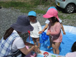 じょうろで水まきをしたり、お魚すくいで遊んだり