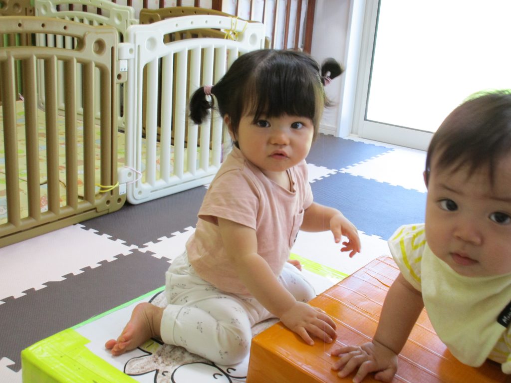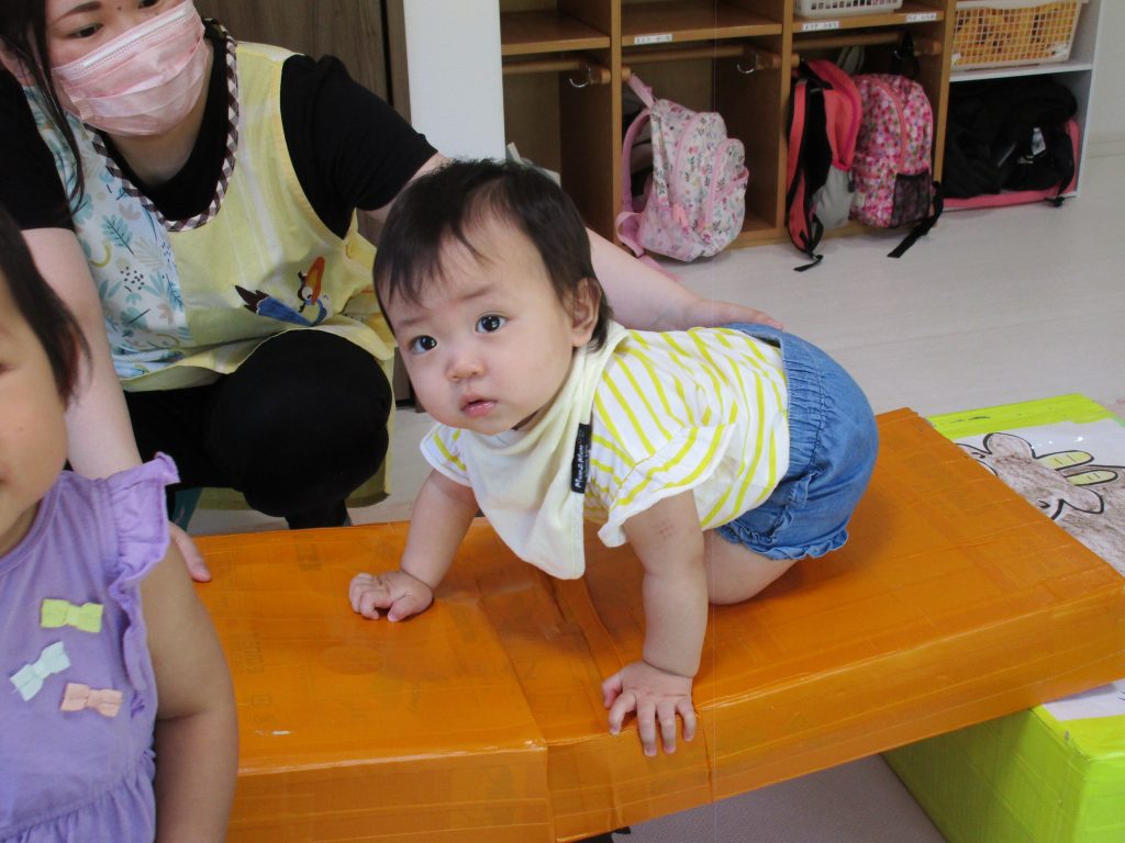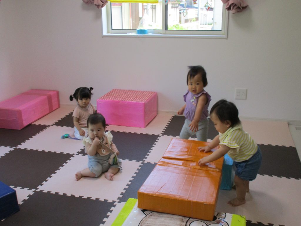 0歳児さんはお部屋でダンボール箱の積木で遊びました!!