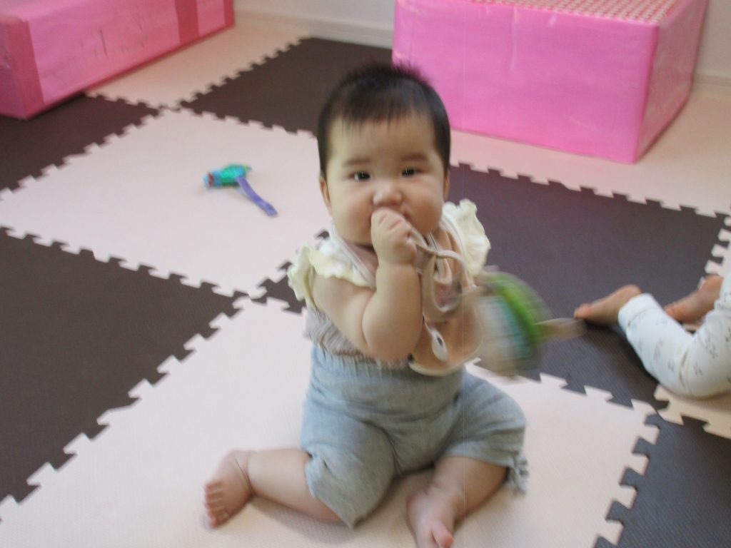 0歳児さんはお部屋でダンボール箱の積木で遊びました(^_^)