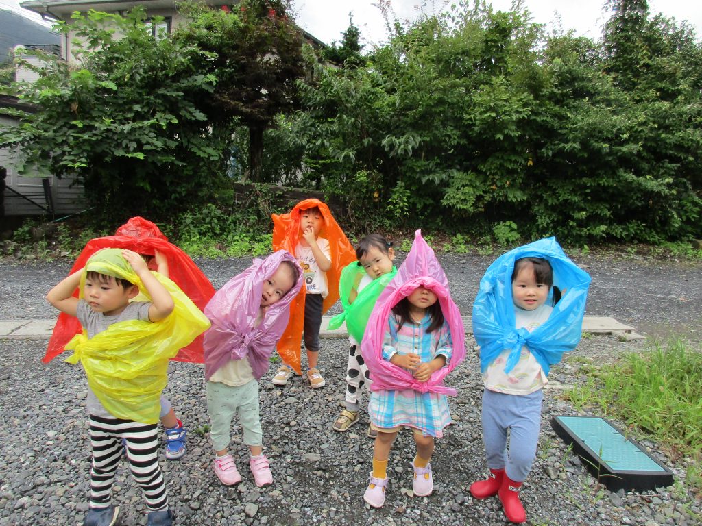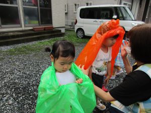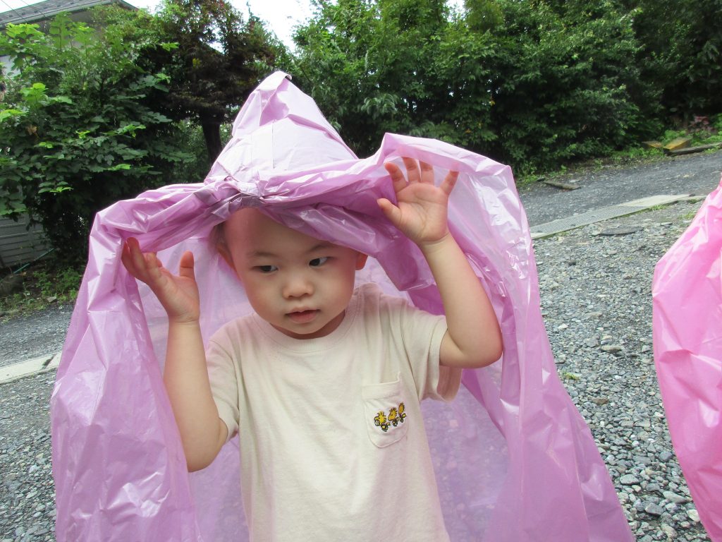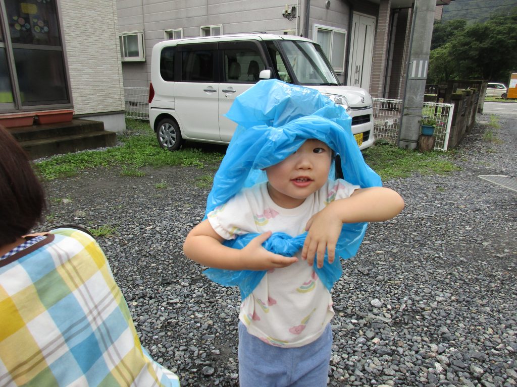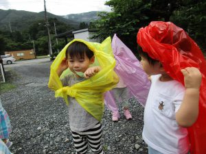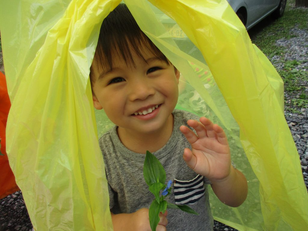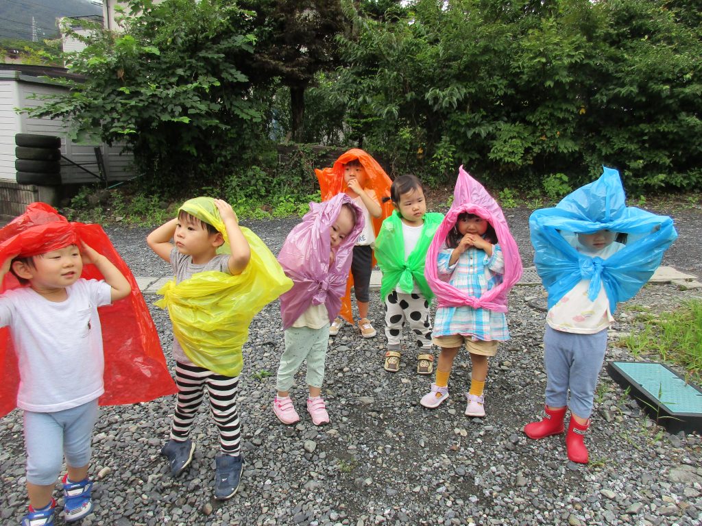 雨がポツポツ降ってきて、先生が手作りしてくれたカッパを着ました(^_^)