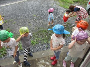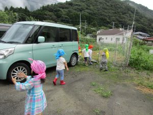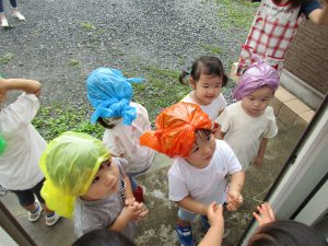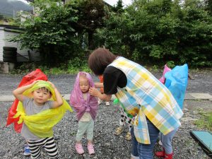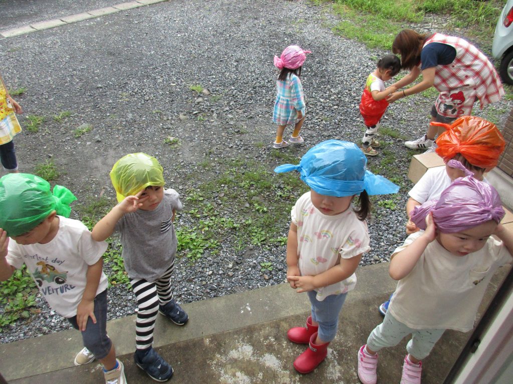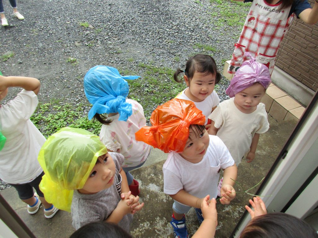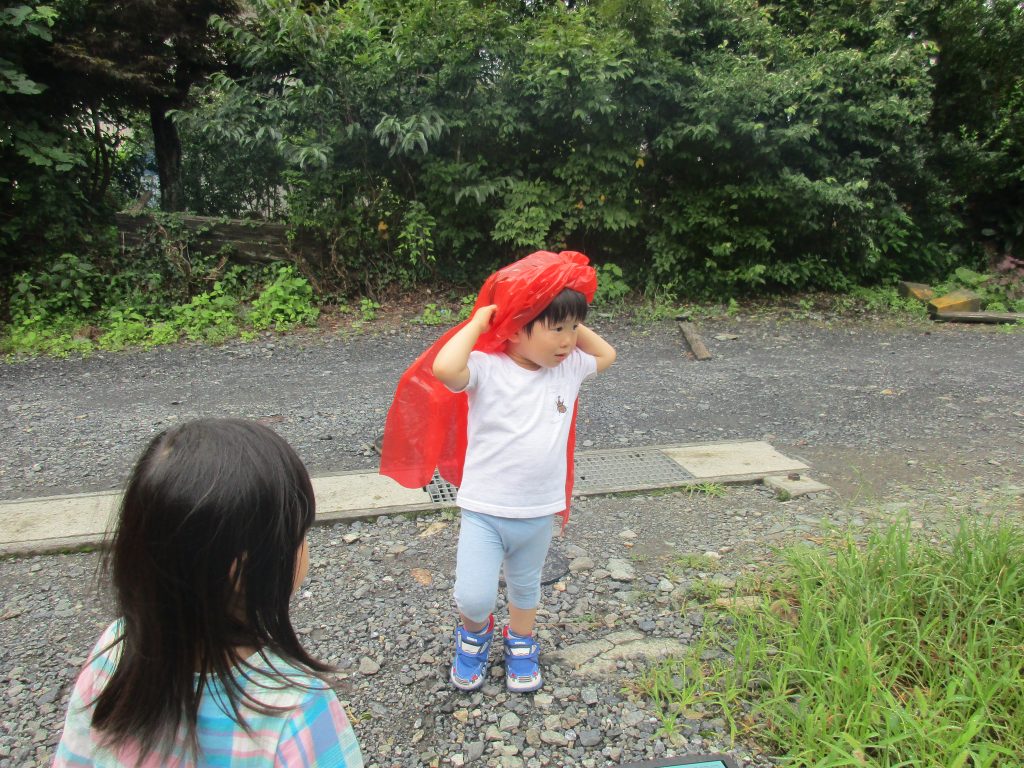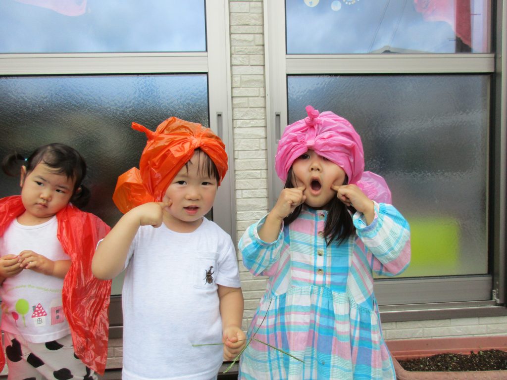 雨がポツポツ降ってきて、先生が手作りしてくれたカッパを着ました(^_^)