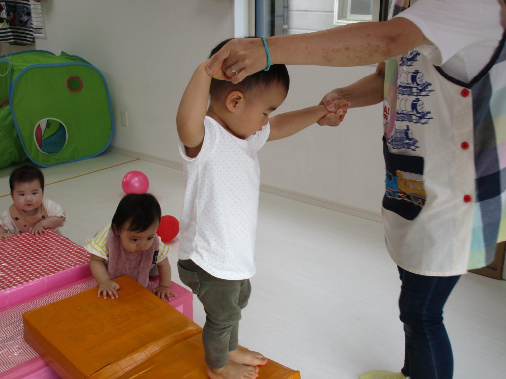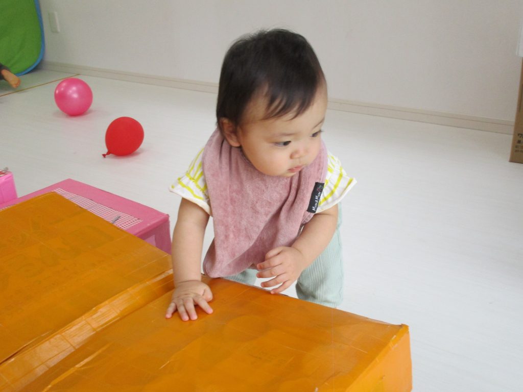 ダンボール箱の積木で橋を作り渡って歩いたりしました(^o^)