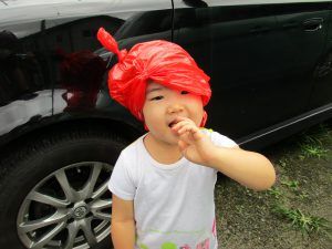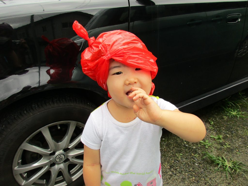 2歳児さんは着ていた手作りカッパを今度は頭に被り始めたので、