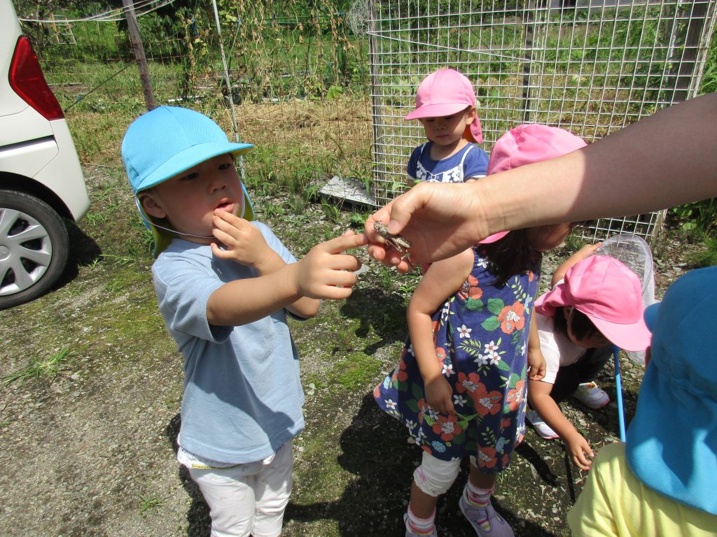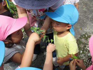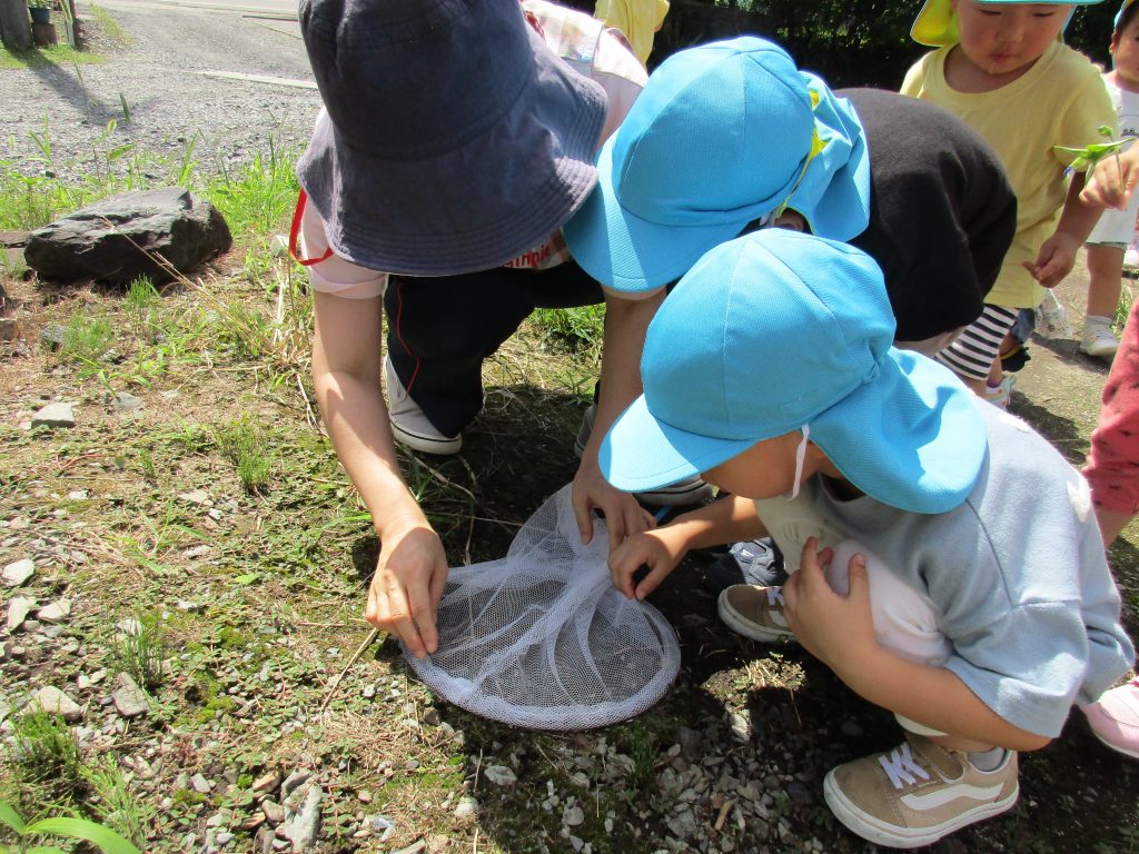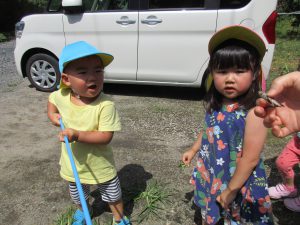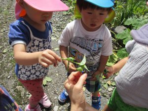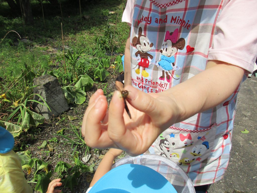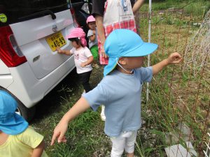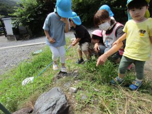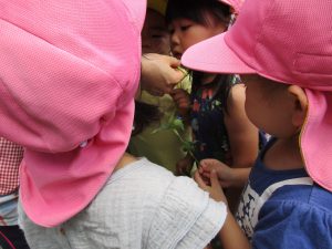 保育士がアミを持ち、子ども達はトンボを見つけると保育士に