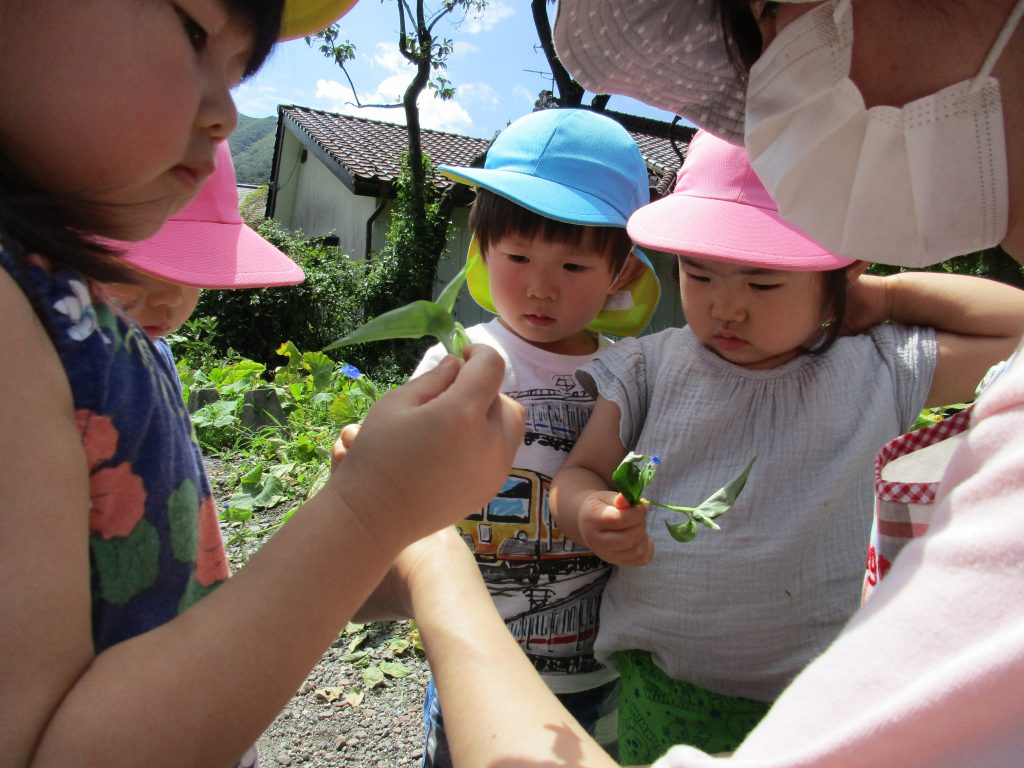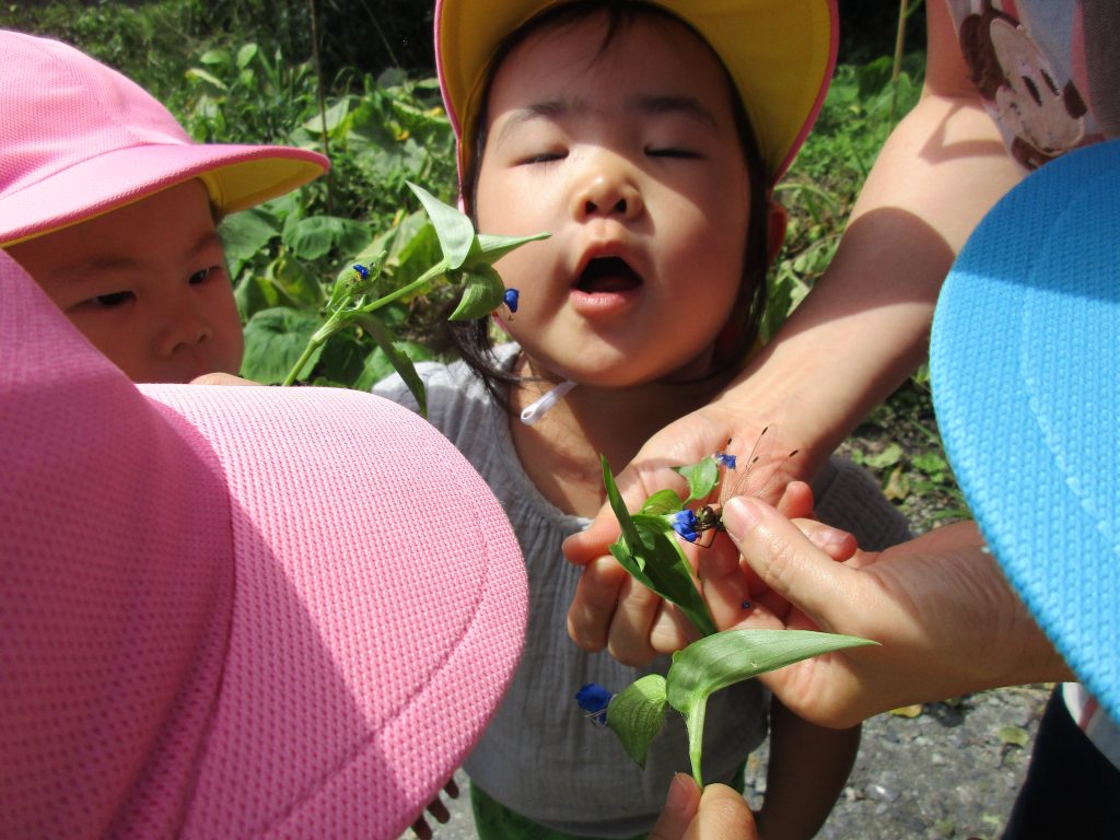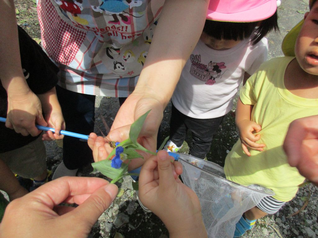 昨日摘んできたつゆ草をトンボに食べさせてみる為にみんなで