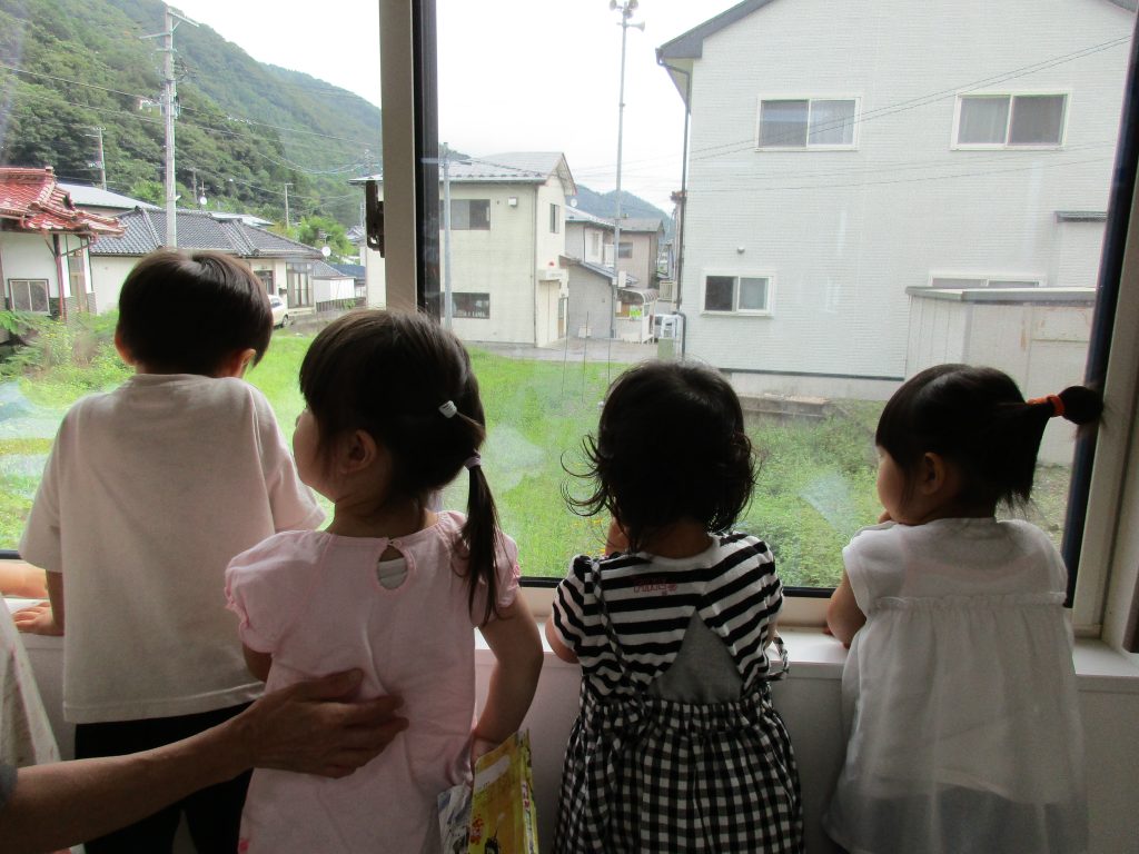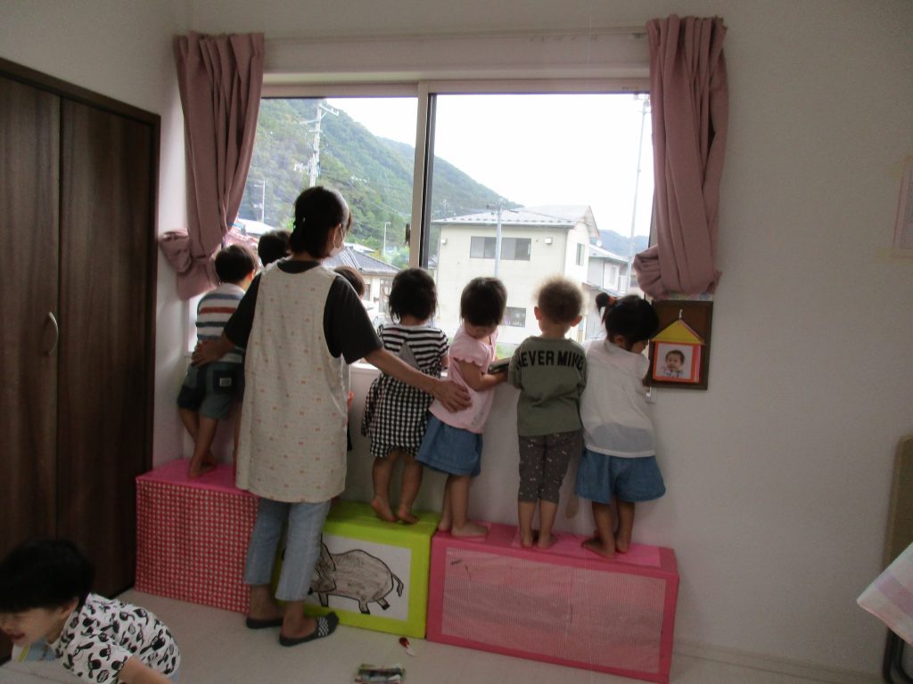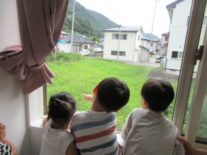 朝の自由遊び時間、お外にアゲハチョウが飛んでいるのを見つけ、