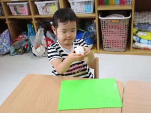 2歳児さんは手の平で丸める練習をして雪だるまや