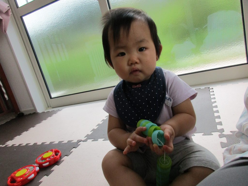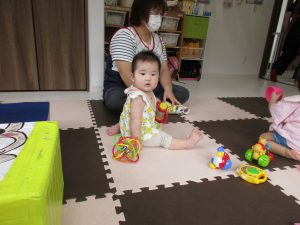 今日は0歳児さんはダンボール箱の積木と玩具で遊び、