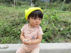 小石をまじまじと観察して笑顔を