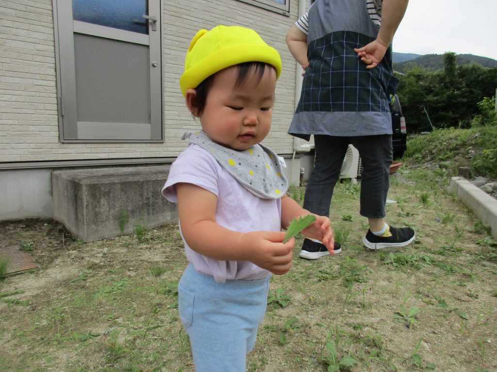 葉っぱを手渡すと触って感触を楽しんで