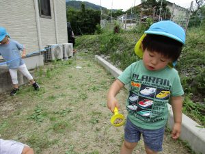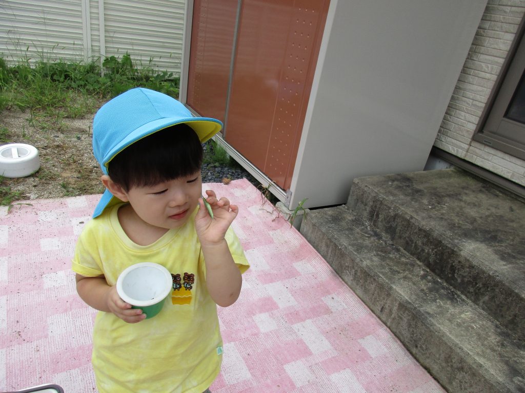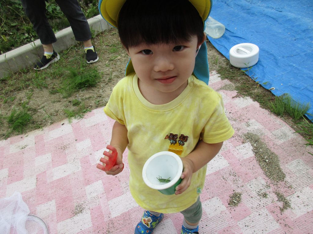 バッタを捕まえてもらい砂場玩具のコップの