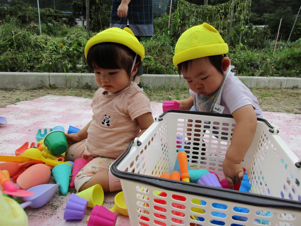 0歳時のお友達は砂場玩具をカゴから